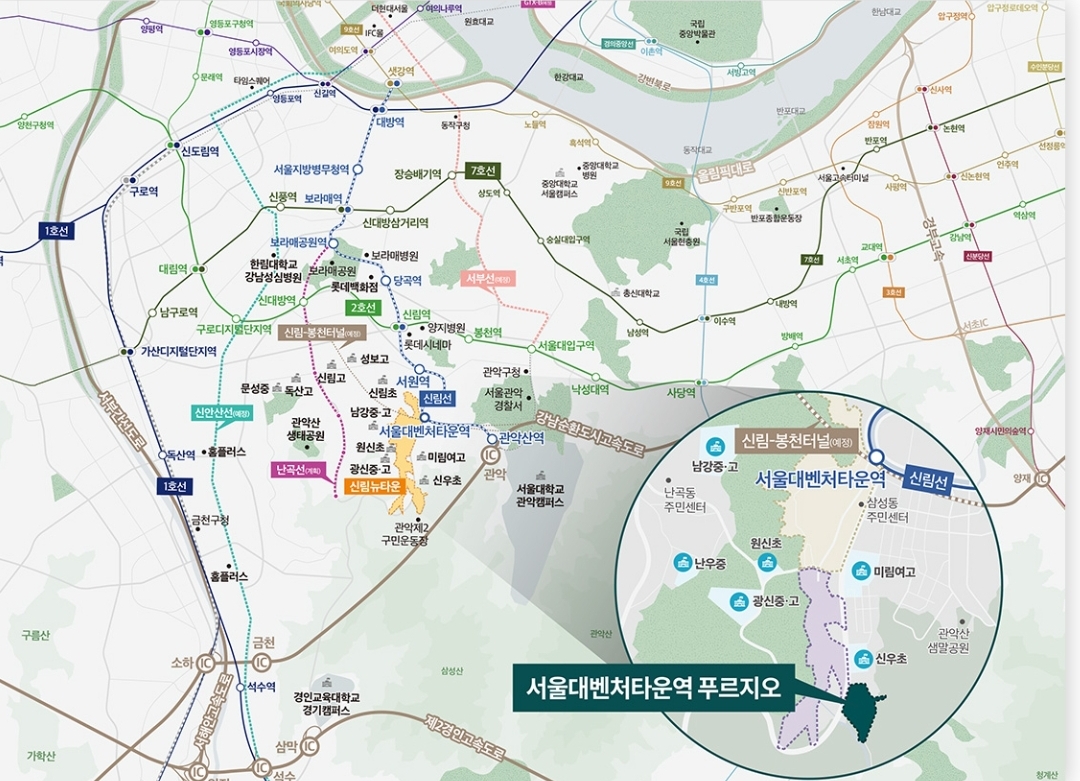 신림선이 2호선, 7호선, 1호선, 9호선까지 환승이 되며강남순환고속도로를 이용하여 물리적 거리 뿐만 아니라 교통도 강남과의 접근성이 좋습니다